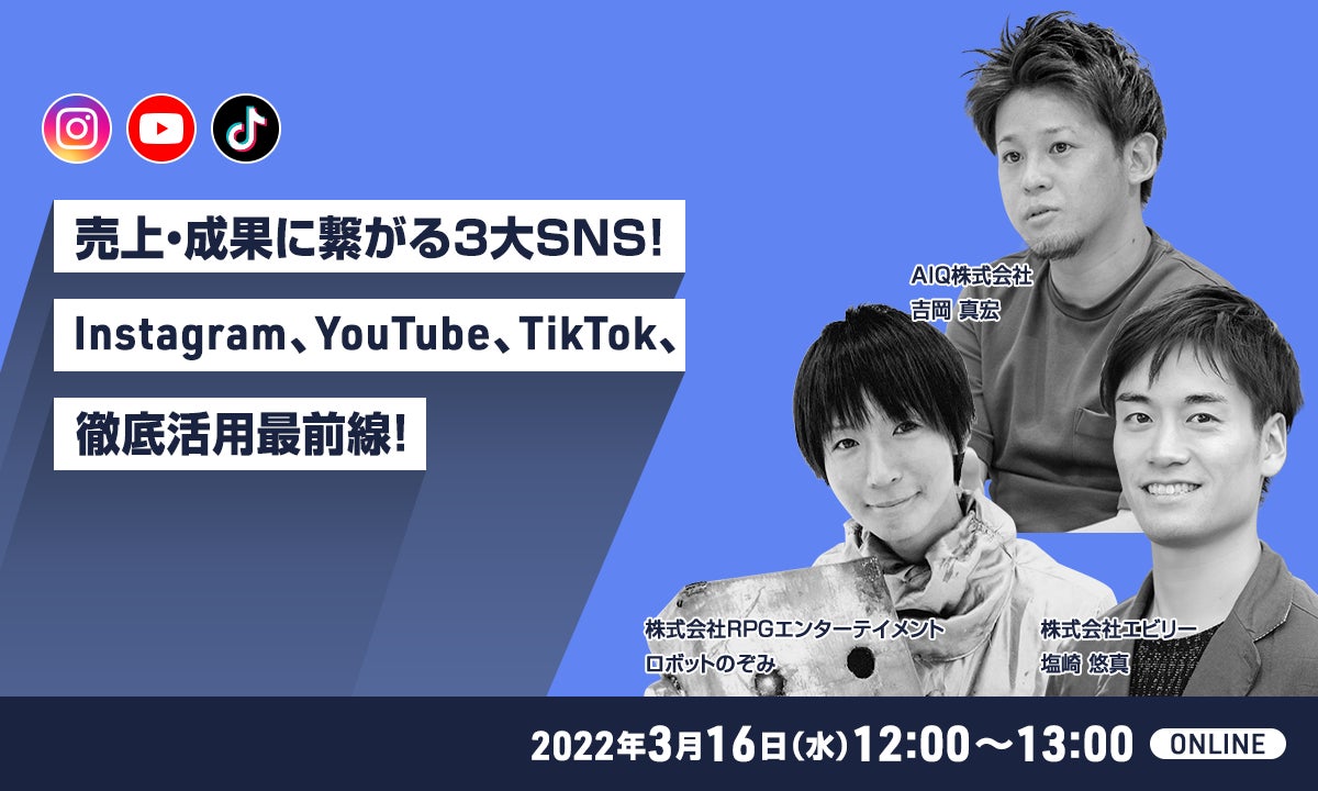 弊社は、AIQ株式会社(本社:東京都新宿区、代表取締役社長:高松睦、以下AIQ)と株式会社RPGエンターテイメント(本社:東京都世田谷区、代表:杉浦希介(ロボットのぞみ)、以下RPGエンターテイメント)と共催セミナーを開催することを決定しました。2022年3月16日(水)に「売上・成果に繋がる3大SNS!〜Instagram、YouTube、TikTok、徹底活用最前線!〜」と題して無料オンラインセミナーを開催いたします。