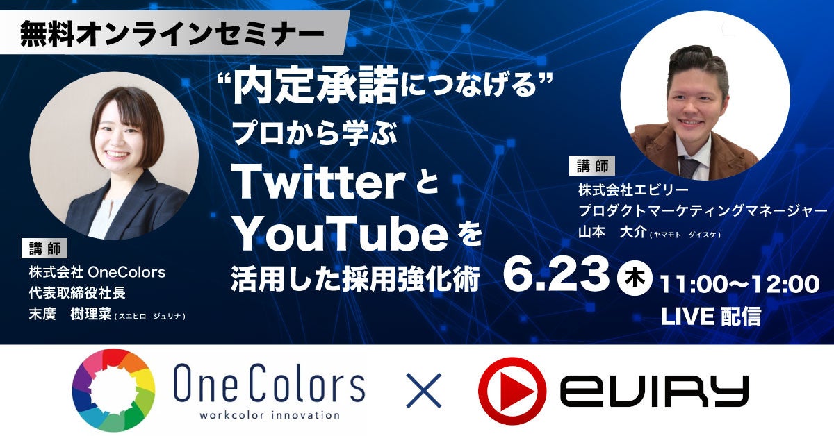 今回は、若者にも親しみ深いSNSであるTwitterとYouTubeを活用して、どのように会社の魅力を伝えて内定承諾につなげるかといったテーマで、SNS採用/SNS広報を強みとするOneColorsと、YouTubeを活用した採用広報を強みとするエビリーが対談を行います!